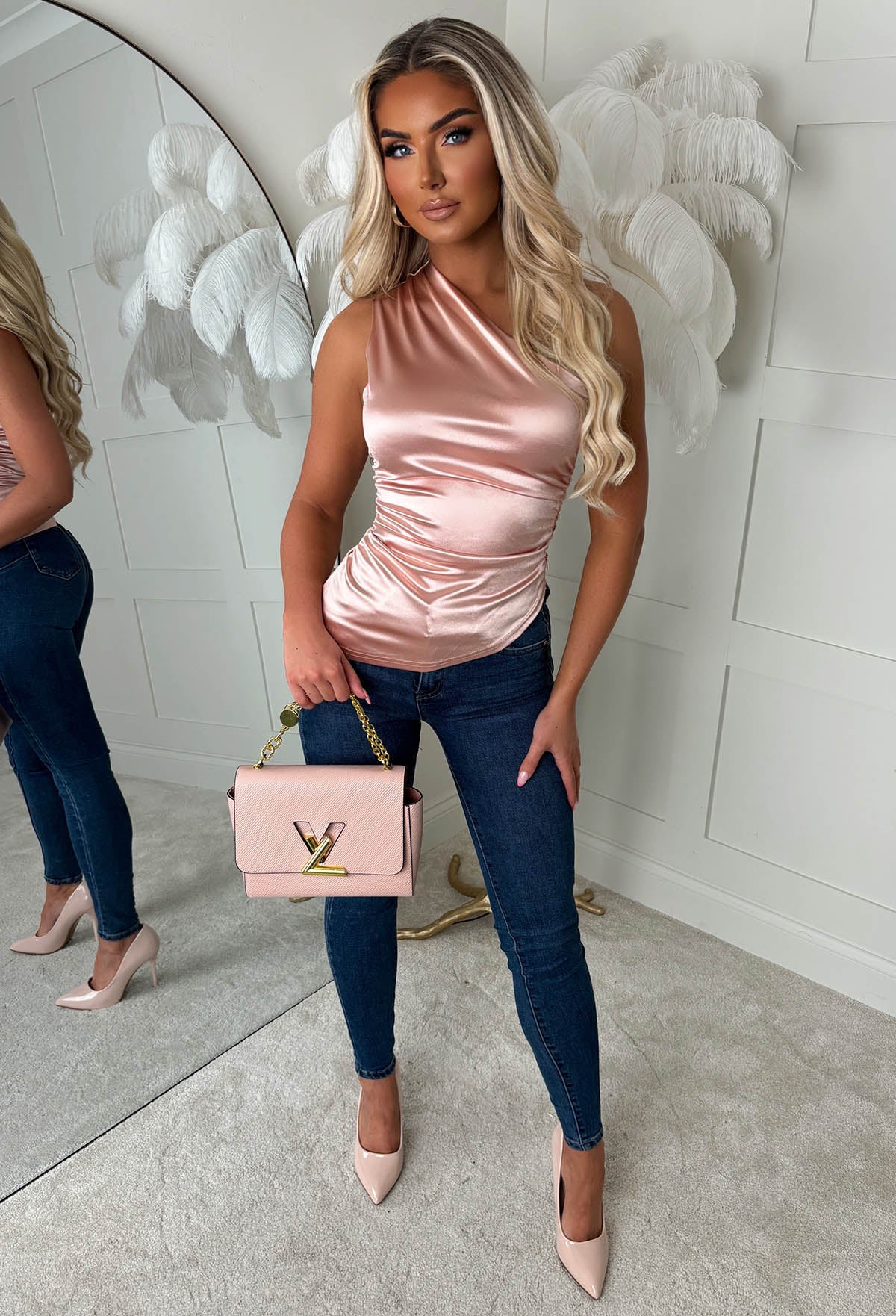 Romance Dreams Rose Gold Stretch Satin Ruched One Shoulder Top